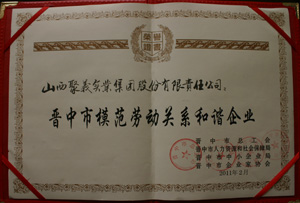 2011.2山西聚義實(shí)業(yè)集團(tuán)晉中市勞動(dòng)關(guān)系和諧企業(yè)晉中市人力資源局和社會(huì)保障局